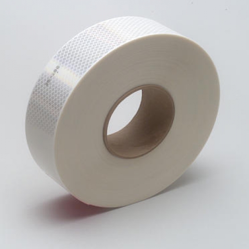 Solid white Diamond Grade™ Conspicuity marking with pressure sensitive adhesive. Available in standard rolls to be cut and applied to flat surfaces on trucks, trailers, and large vehicles for enhanced visibility.