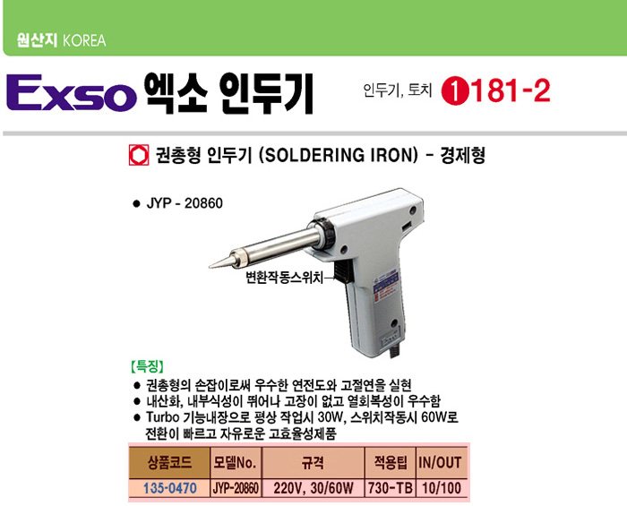 [Exso]°æÁ¦Çü ±ÇÃÑÇü Àεαâ(JYP-20860, 220V, 30/60Wat)(Soldering Iron)