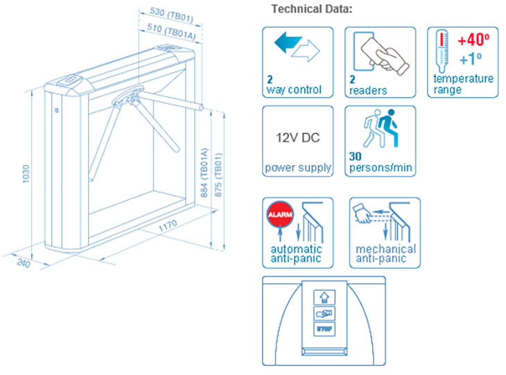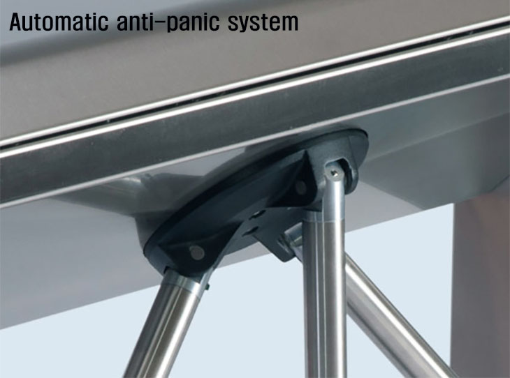 The turnstiles are operated from the remote control panel and can be easily integrated into most access control systems. After each passage the barrier arms are automatically returned to home position. Smoothness of reset is ensured by the damper. The arm rotation sensors track passages through the turnstile to ensure accurate count inputs to access control systems for reports generation.