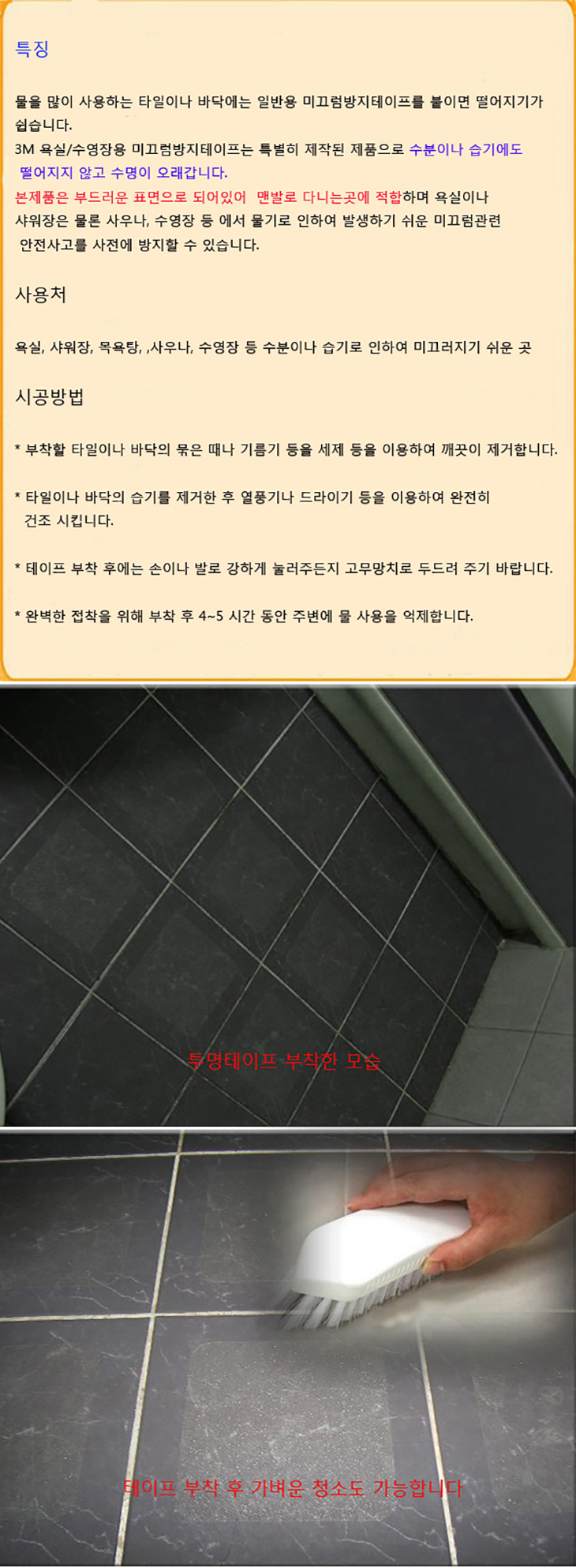 ¢º  Ư    Â¡ : ŸÀÏÀº Ç¥¸éƯ¼º»ó ÀϹÝÀûÀÎ Á¢ÂøÁ¦·Î ¸¸µé¾îÁø Å×ÀÌÇÁ´Â ¼öºÐ¿¡ ¶³¾îÁý´Ï´Ù. ŸÀÏ¿ëÀ¸·Î Ư¼öÁ¦ÀÛµÈ ¹Ì²ô·³¹æÁö