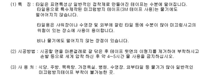 ¢º »ç¿ëó : ½Ä´ç, ÁÖ¹æ, ¸ñ¿åÅÁ, º´¿ø, ¼ö¿µÀå, ¿ÜºÎŸÀÏµî ¹°±â°¡ ¸¹¾Æ ÀϹÝÀûÀÎ ¹Ì²ô·³¹æÁö Å×ÀÌÇÁ ºÎÂøÀÌ ºÒ°¡´É ÇѰ÷