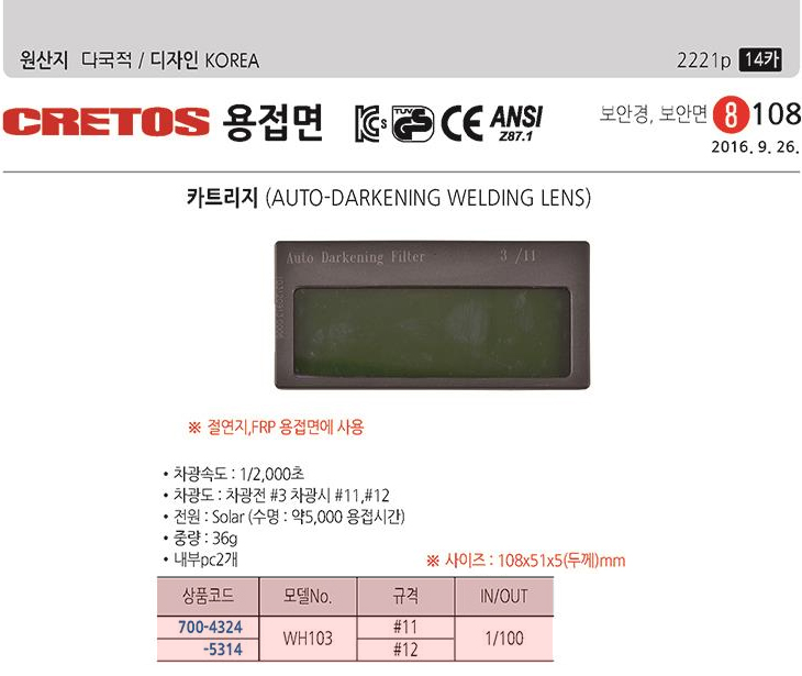 [CRETOS/Å©·¹Å佺] Àý¿¬Áö/FRP ¿ëÁ¢¸é¿ë ÀÚµ¿Â÷±¤ īƮ¸®Áö(WH103, Â÷±¤¼Óµµ:1/2000ÃÊ, 108x51x5mm)(Auto Darkening Weldingh Lens)