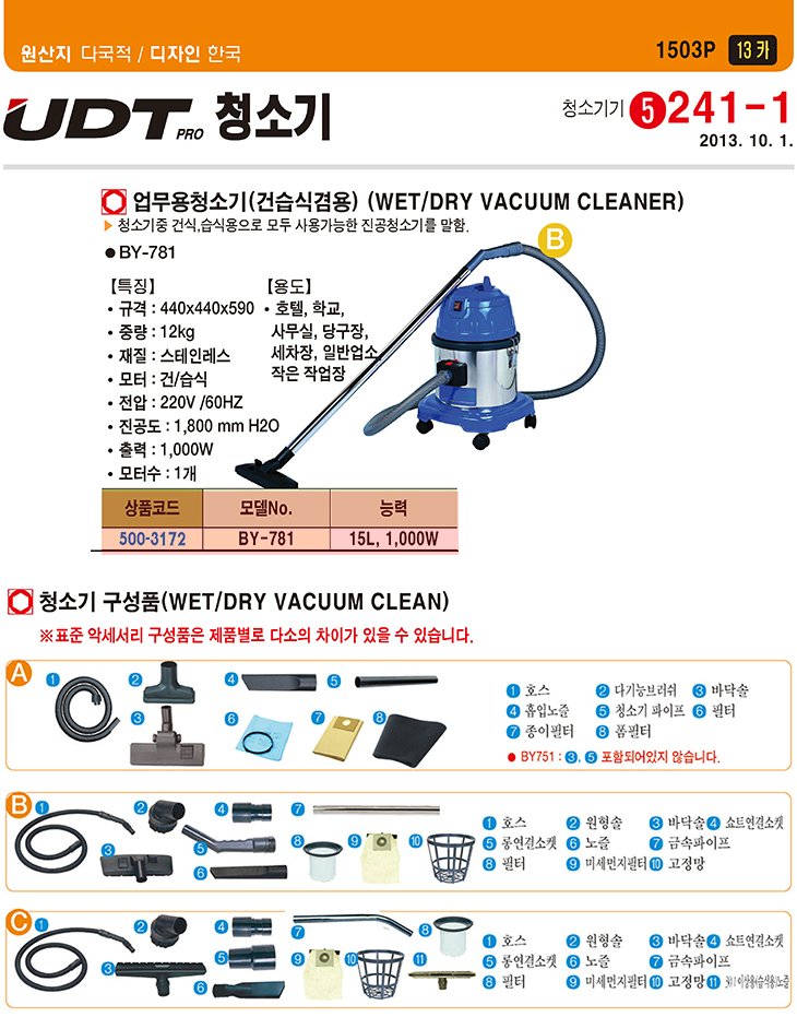 [UDT] ¾÷¹«¿ëû¼Ò±â(BY-781, °Ç½Ä/½À½Ä °â¿ë, 15¸®ÅÍ, 1000Watt)(WET/DRY VACUUM CLEANER)=>Á¦Ç°´ÜÁ¾!