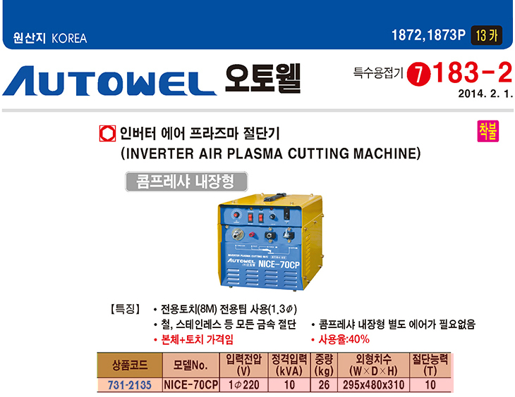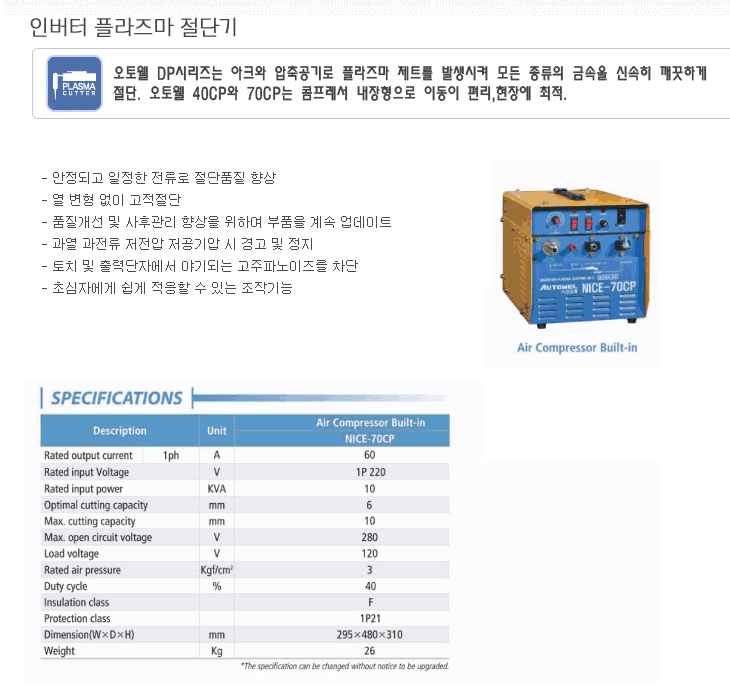 [¿ÀÅäÀ£] ÀιöÅÍ ¿¡¾î ÇÁ¶óÁ Àý´Ü±â(NICE-70CP, ´Ü»ó220V, 10KVA)(Inverter Air PLASMA Cutting Machine)