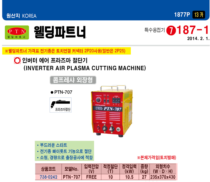 [À£µùÆÄÆ®³Ê] ÀιöÅÍ ¿¡¾î ÇÁ¶óÁÀý´Ü±â(PTN-707, ´Ü»ó220V, 10.5KWatt, ÄÞÇÁ·¹»þ¿ÜÀåÇü)(Inverter Air PLASMA Cutting Machine)