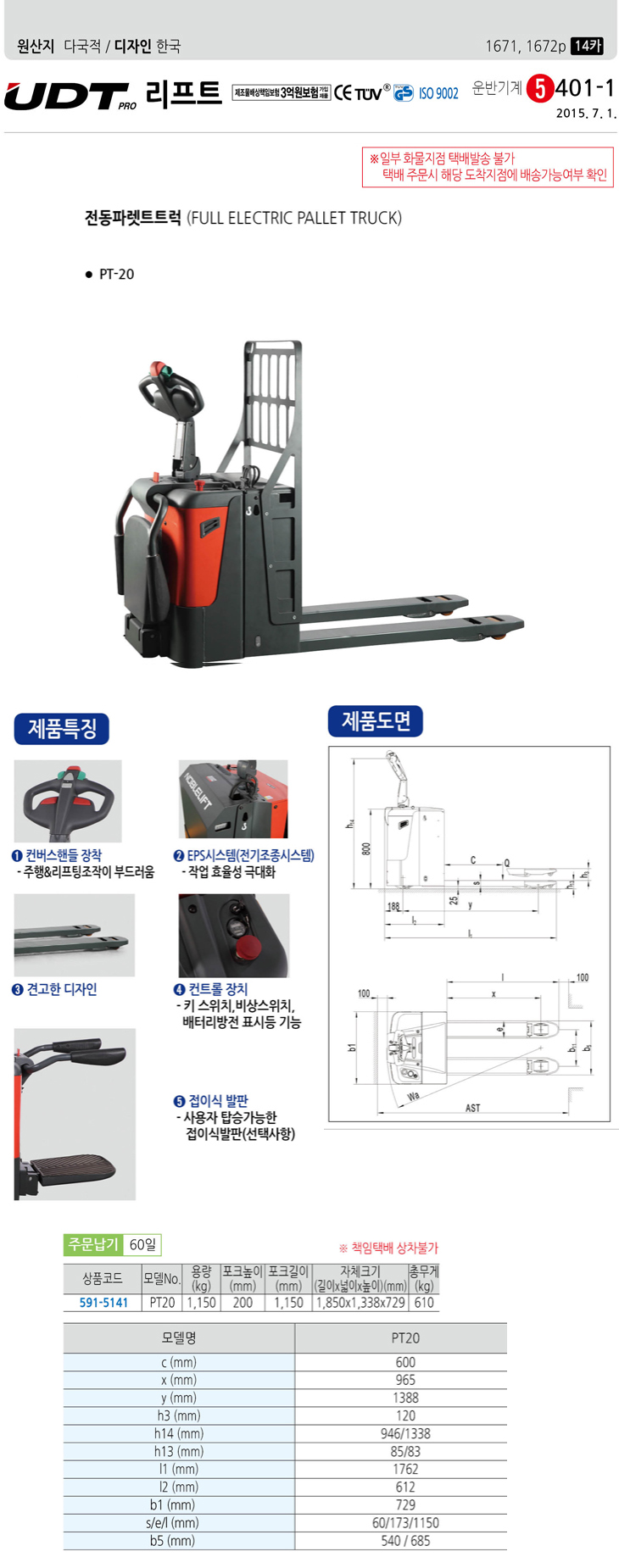 [UDT] Àüµ¿ ÆÄ·¿Æ® Æ®·°(PT-20, 1.1Ton, ÁÖÇà ¹× ¸®ÇÁÆÃ ÀÚµ¿)(Full Electric Pallet Truck)(ÁÖ¹®Ç°)=>Á¦Ç°´ÜÁ¾!