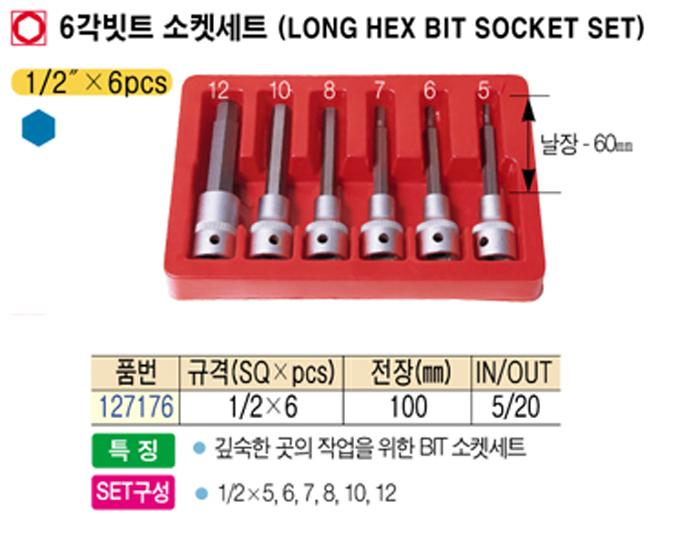 [½º¸¶Åä] 6°¢ºøÆ® ¼ÒÄϼ¼Æ®(Long hex bit socket set) 1/2x6pcs