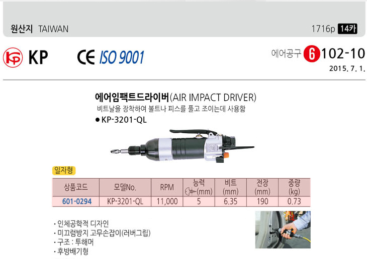 [KP] ¿¡¾îÀÓÆÑÆ® µå¶óÀ̹ö(KP-3201-QL, 11000RPM, ´É·Â:5mm)(Air Impact Driver)