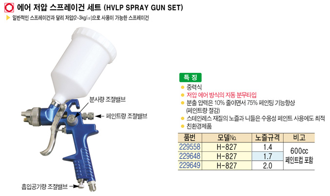 [ºí·ç¹öµå] H-827 ¿¡¾î Àú¾Ð ½ºÇÁ·¹ÀÌ°Ç ¼¼Æ® (HVLP SPRAY GUN SET)