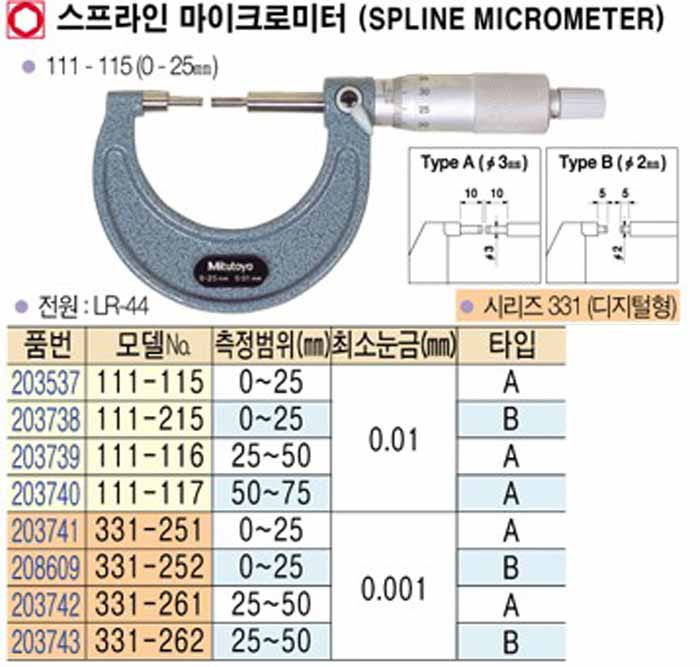 [mitutoyo] ½ºÇÁ¶óÀÎ ¸¶ÀÌÅ©·Î ¹ÌÅÍ (SPLINE MICROMRTER) 111-117