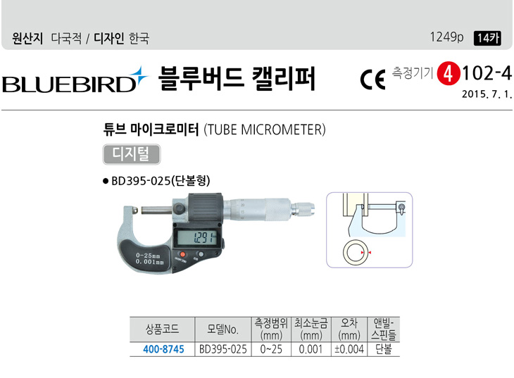 [ºí·ç¹öµå] µðÁöÅÐ Æ©ºê ¸¶ÀÌÅ©·Î¹ÌÅÍ(´Üº¼Çü, BD395-025,0~25mm, 0.001mm)(Digital Tube micrometer)