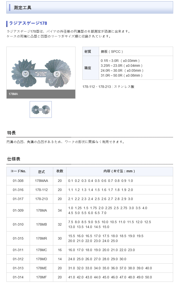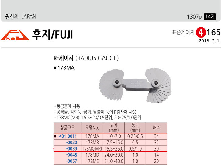 [ÈÄÁö] R-°ÔÀÌÁö(178MA, 1.0~7.0mm, µîÂ÷:0.25/0.5mm, 34¸Å)(Radius Gauge)