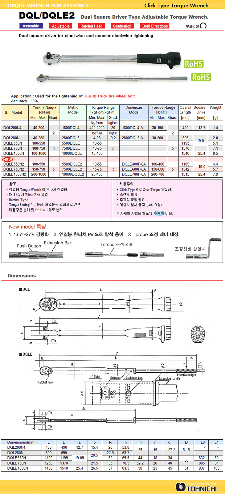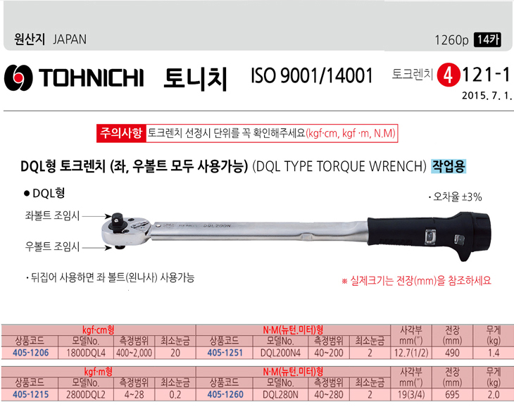 [TOHNICHI/Åä´ÏÄ¡] DQLÇü ÅäÅ©·»Ä¡(1800DQL4 400~2000kgf.cm/DQL200N4 40~200NM, Á¿캼Ʈ °â¿ë)(Torque Wrench)