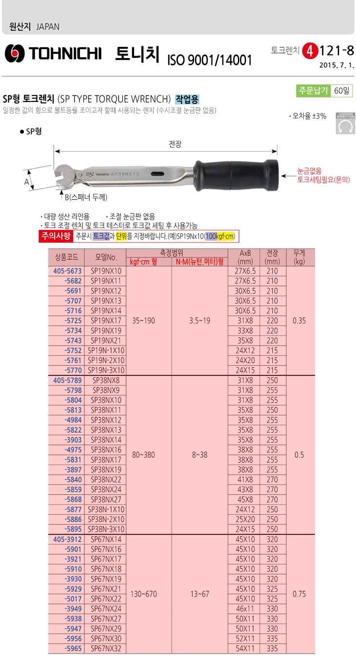 [Åä´ÏÄ¡/TOHNICHI] SPÇü ÀÛ¾÷¿ë ÅäÅ©·»Ä¡(SP67N, ´Ù¾çÇѸ𵨠¼±Åð¡´É)(SP Type Torque Wrench)