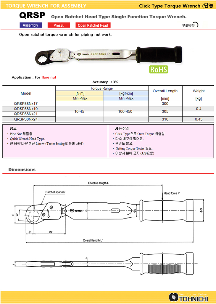 [TOHNICHI/Åä´ÏÄ¡] QRSPÇü ÅäÅ©·»Ä¡(´Ù¾çÇѸ𵨼±Åð¡´É)(Open Ratchet Head Type Single Function Torque Wrench)