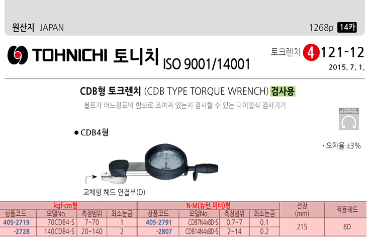 [TOHNICHI/Åä´ÏÄ¡] °Ë»ç¿ë CDB4ŸÀÔ ´ÙÀ̾óÇü ÅäÅ©·»Ä¡(140CDB4-S 20~140kgf.cm/CDB14N4x8D-S 2~14nm)(Dial Torque Wrench)