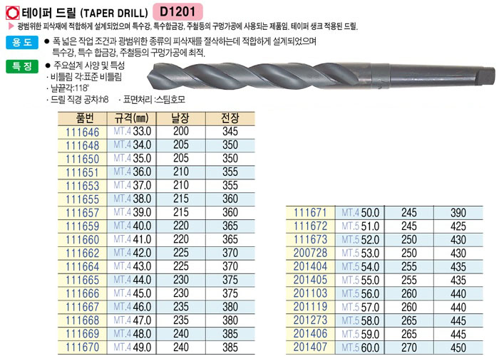 [YG]Å×ÀÌÆÛ µå¸±(TAPER DRILL)D1201 43.0~52.0mm
