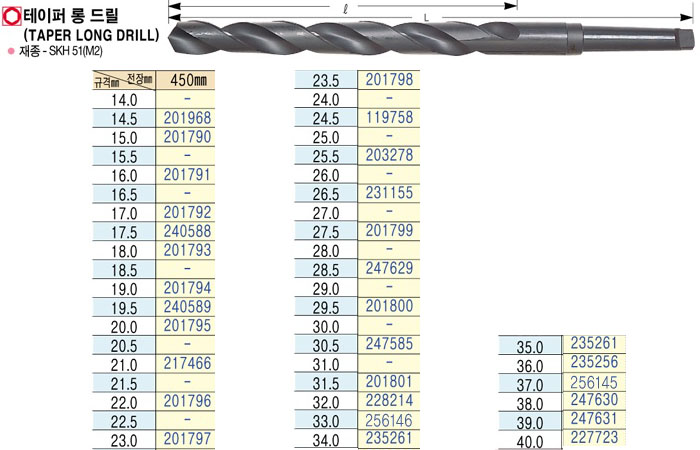 [YG]Å×ÀÌÆÛ ·Õ µå¸±(TAPER LONG DRILL)450mm 14.5mm~19.0mm