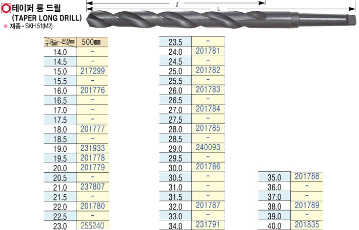 [YG]Å×ÀÌÆÛ ·Õ µå¸±(TAPER LONG DRILL)500mm 14.5mm~19.0mm