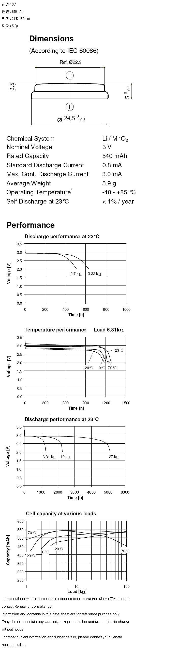 Renata CR2450-1BP(3V 540mAh)
