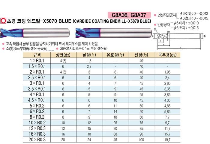 [¿ÍÀÌÁö¿ø] Ãʰæ ÄÚÆÃ ¿£µå¹Ð-X5070 (CARBIDE COATING ENDMILL-X5070) 1¡¿R0.1 2F ~ 3¡¿R0.1 4F