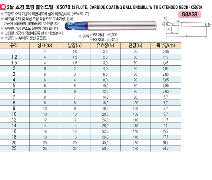 [¿ÍÀÌÁö¿ø] 2³¯ Ãʰæ ÄÚÆÃ º¼¿£µå¹Ð-X5070 (2 FLUTE, CARBIDE COATING ALL ENDMILL WITH EXTENDED NECK-X5070) 1 ~ 8
