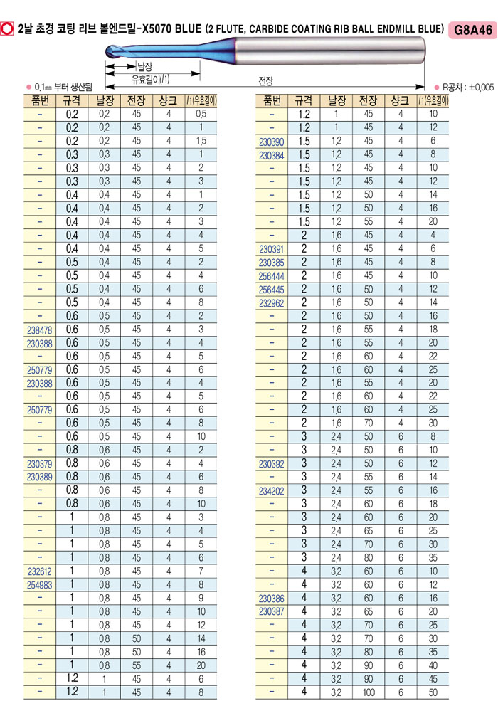 [¿ÍÀÌÁö¿ø] 2³¯ Ãʰæ ÄÚÆÃ ¸®ºê º¼¿£µå¹Ð-X5070 (2 FLUTE, CARBIDE COATING RIB BALL ENDMILL) ³¯Àå0.8 À¯È¿±æÀÌ5 ~ ³¯Àå0.8 À¯È¿±æÀÌ2