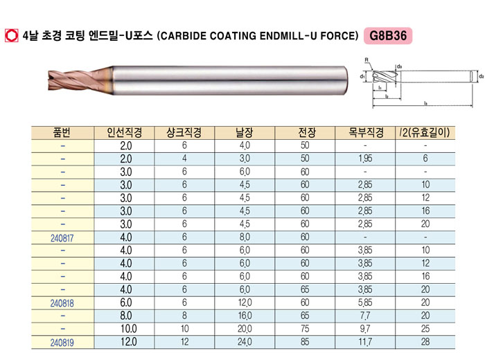 [¿ÍÀÌÁö¿ø] 4³¯ Ãʰæ ÄÚÆÃ ¿£µå¹Ð-UÆ÷½º (CARBIDE COATING ENDMILL-U FORCE) ³¯Àå6.0 À¯È¿±æÀÌ10 ~ ³¯Àå24.0 À¯È¿±æÀÌ28