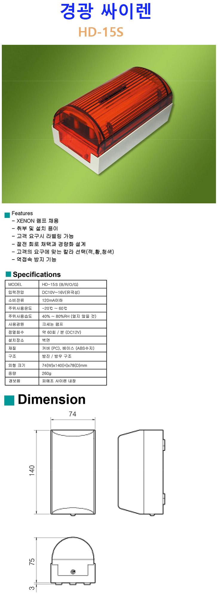 [SASO] 汤 ̷(HD-15S, ̷+汤 ü, ǿ, 110dB, DC12V, ֵ Xenon ä, 139x75x72mm)