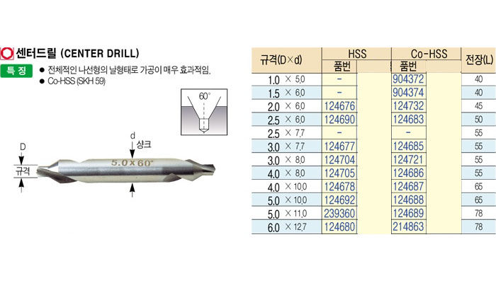 [DYC]¼¾Å͵帱(CENTER DRILL)HSS 5.0 x 10.0 ~ 6.0 x 12.7