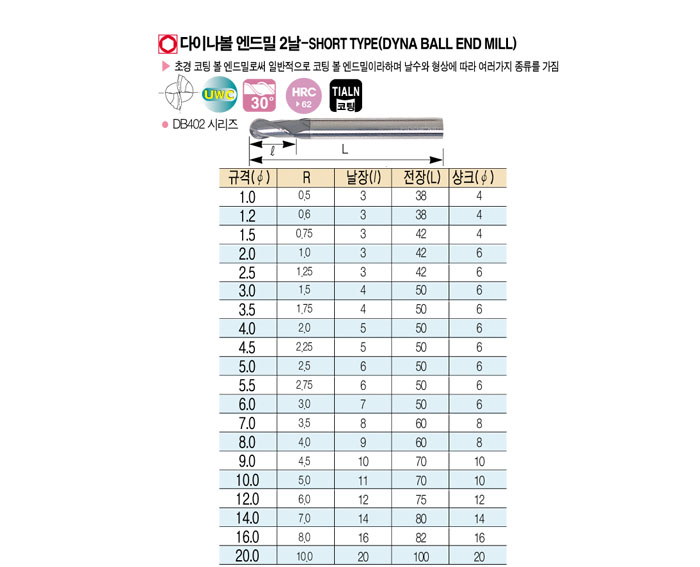 [ÇϳªÅø½º] ´ÙÀ̳ªº¼ ¿£µå¹Ð 2³¯-SHORT TYPE (DYNA BALL END MILL) 5.5 ~ 20.0