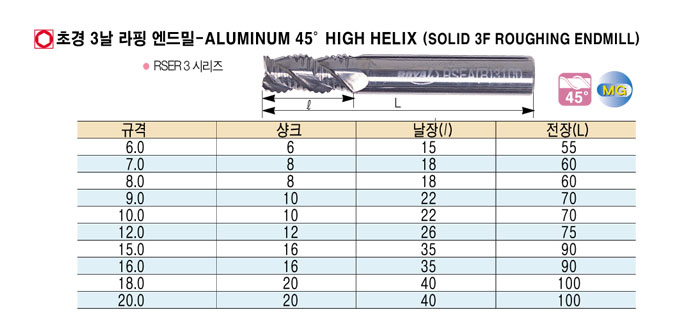 [·Î¾â] Ãʰæ 3³¯ ¶óÇÎ ¿£µå¹Ð-ALUMINUM 45¡Æ HIGH HELIX (SOLID 3F ROUGHING ENDMILL) 6.0 ~ 20.0=>Á¦Ç°´ÜÁ¾!