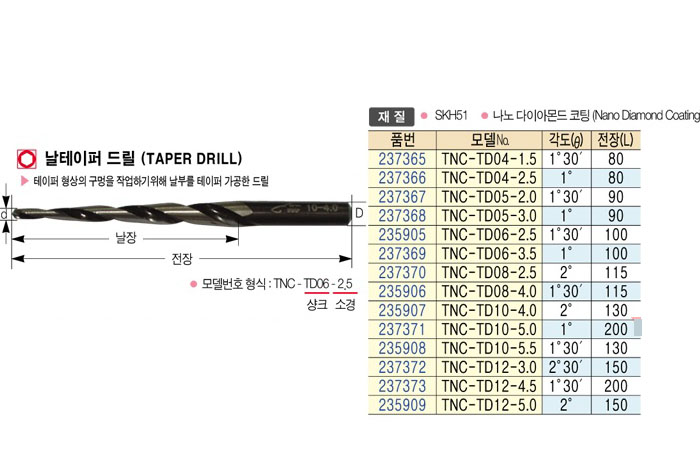 [TNC]³¯Å×ÀÌÆÛ µå¸±(TAPER DRILL)TD04-1.5~TD08-4.0