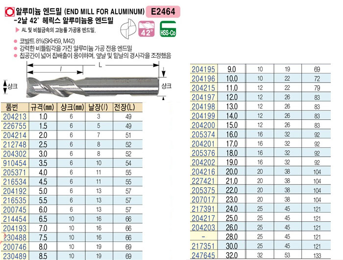 [YG]¾Ë·ç¹Ì´½ ¿£µå¹Ð(END MILL FOR ALUMINUM)-2³¯ 42¢ªÇ츯½º ¾Ë·ç¹Ì´½¿ë ¿£µå¹Ð6.0mm~12.0mm
