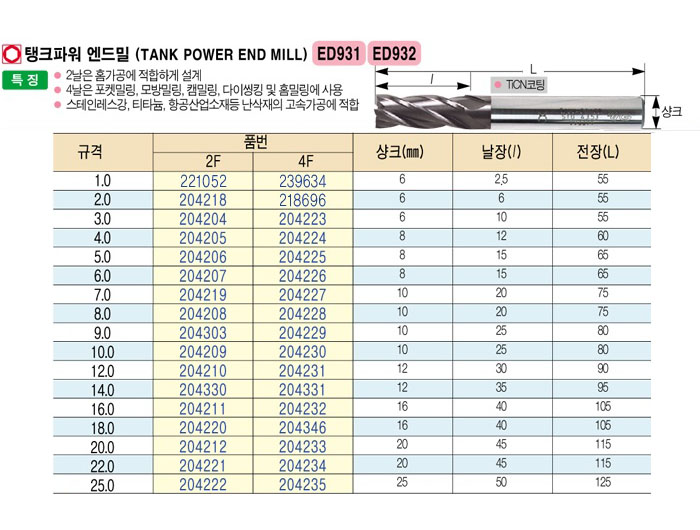 [YG]ÅÊÅ©ÆÄ¿ö ¿£µå¹Ð(TANK POWER END MILL)4F 1.0mm~10.0mm