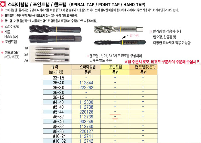 [YG]½ºÆÄÀÌ·²ÅÇ/Æ÷ÀÎÆ®ÅÇ/ÇÚµåÅÇ(SPIRAL TAP/POINT TAP/HAND TAP)ÇÚµåÅÇ(SET) #8-32~#10-32