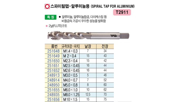 [YG]½ºÆÄÀÌ·²ÅÇ-¾Ë·ç¹Ì´½¿ë(SPIRAL TAP FOR ALUMINIUM) M1.4 x 0.3 ~ M4.0 x 0.7