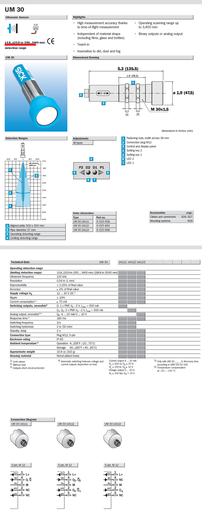 [SICK]UM-30 Ultrasonic Sensors[13.8...133.9 in (350...3400 mm)]