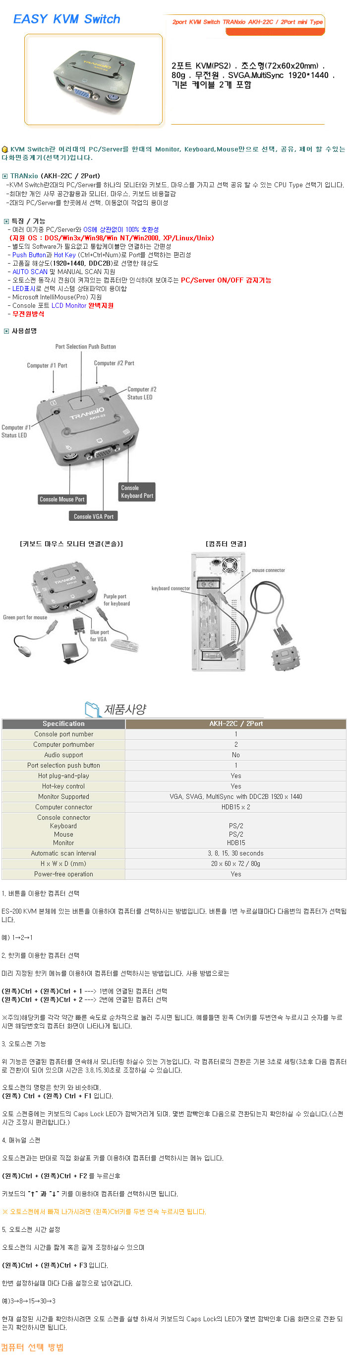 [½Ã½º¶óÀÎ] EASY KVM Switch 2port KVM Switch TRANxio AKH-22C / 2Port mini Type