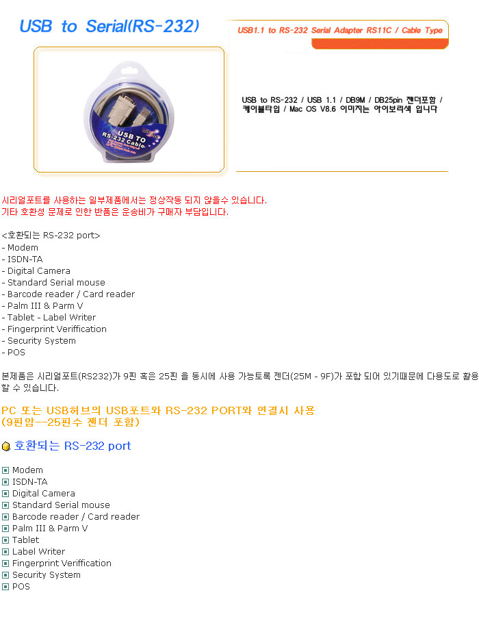 [½Ã½º¶óÀÎ] USB to Serial(RS-232) USB1.1 to RS-232 Serial Adapter RS11C / Cable Type