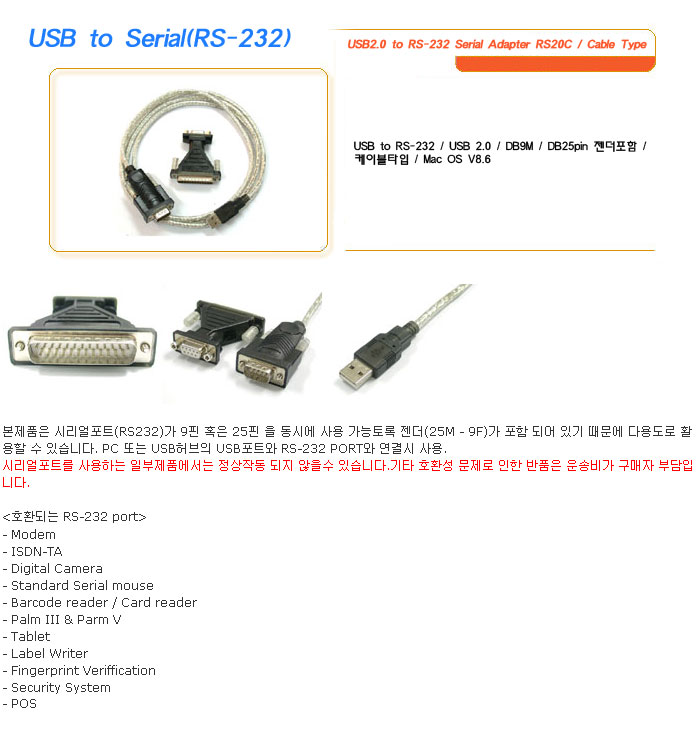 [½Ã½º¶óÀÎ] USB to Serial(RS-232) USB2.0 to RS-232 Serial Adapter RS20C / Cable Type
