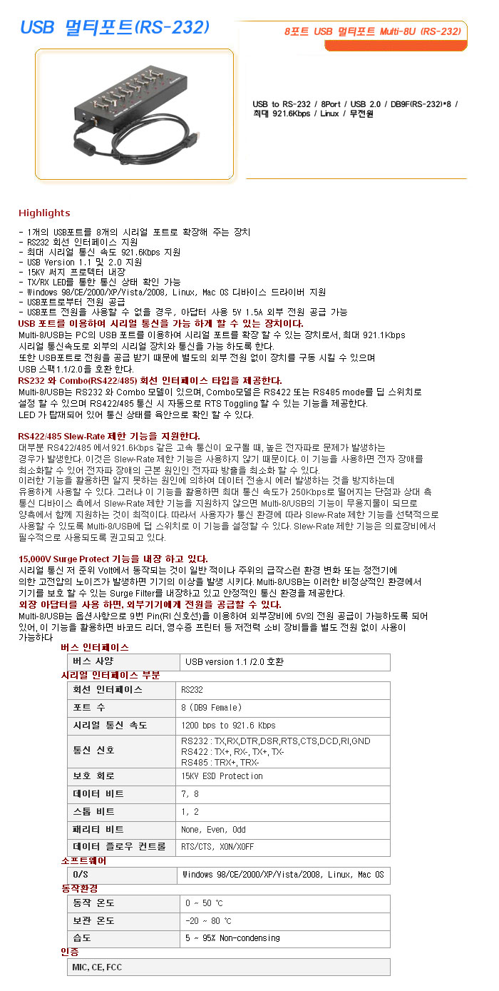 [½Ã½º¶óÀÎ] USB ¸ÖƼÆ÷Æ®(RS-232) 8Æ÷Æ® USB ¸ÖƼÆ÷Æ® Multi-8U (RS-232)