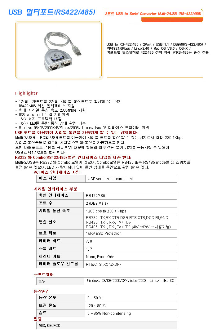 [½Ã½º¶óÀÎ] B ¸ÖƼÆ÷Æ®(RS422/485) 2Æ÷Æ® USB to Serial Converter Multi-2/USB (RS-422/485)