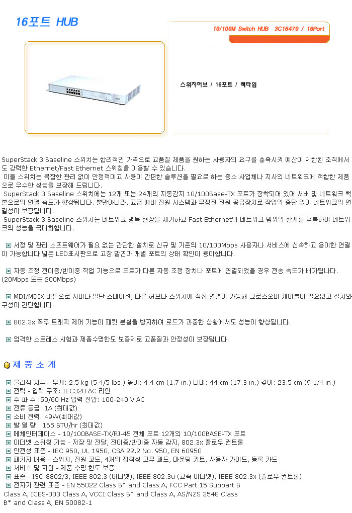 [SL] 10M/100M Switch HUB 3C16792 / 16Port (°¡°Ý¹®ÀÇ)