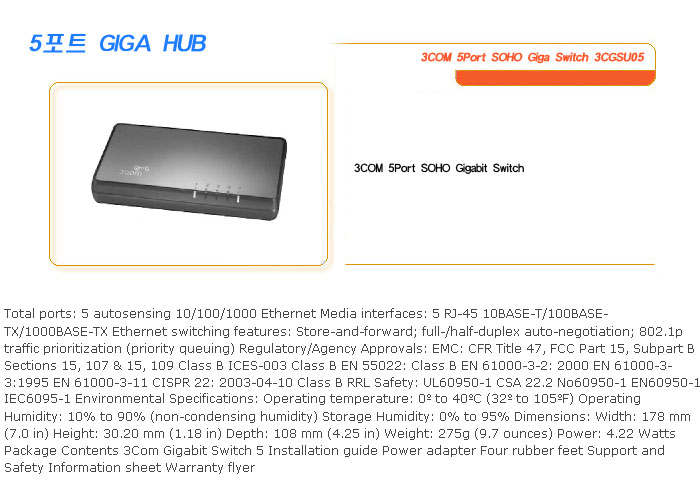 [SL] 3COM 5Port SOHO Giga Switch 3CGSU05 (°¡°Ý¹®ÀÇ)
