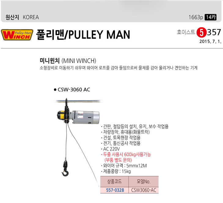 [Ç®¸®¸Ç] ¹Ì´ÏÀ©Ä¡-Ç®¸®¸Ç(CSW3060-AC, ±Ç»óÇÏÁß:300Kg)(PULLY MAN)