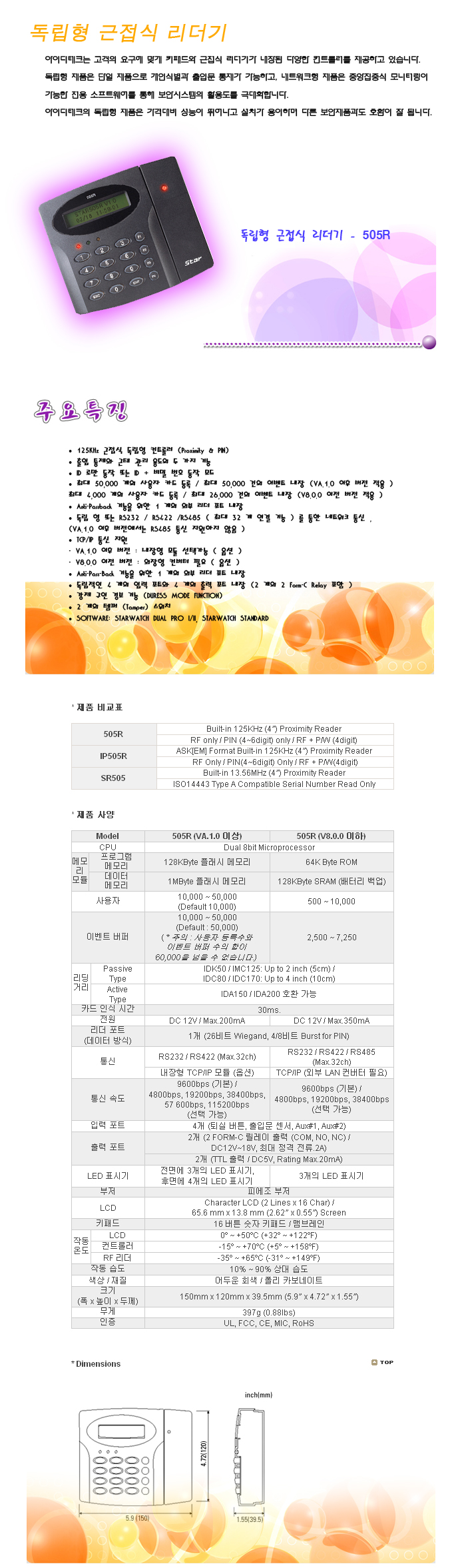 * Ç¥½Ã±Ý¾×Àº ±ÇÀå ¼ÒºñÀÚ °¡°ÝÀ¸·Î 2°³ÀÌ»óÀÇ °æ¿ì °ßÀûÀ» ¿äûÇϽøé ÃÖÀûÀÇ °ßÀû±Ý¾×À» Á¦½ÃÇÕ´Ï´Ù. * ¼¿ï/ºÎ»ê/Æ÷Ç×/°æ³²(â¿ø, ¸¶»ê, ÁøÇØ, ÁøÁÖ)/Àü³²(¼øÃµ, ±¤¾ç) Áö¿ªÀº ¼³Ä¡¸¦ Áö¿øÇÕ´Ï´Ù. * µ¶¸³Çü ±ÙÁ¢½Ä ¸®´õ±â 505R (Proximity + PIN Time & Attendance Access Controller) -. ½Ã½ºÅÛ ÅëÇÕ ¼ÒÇÁÆ®¿þ¾î : SOFTWARE: STARWATCH DUAL PRO I/II, STARWATCH STANDARD -. 10,000°³ÀÇ IDÀúÀå´É·Â -. 7,250°³ÀÇ EVENTÀúÁ¤ ´É·Â -. RF+ºñ¹Ð¹øÈ£ °â¿ë ÀåÄ¡ |