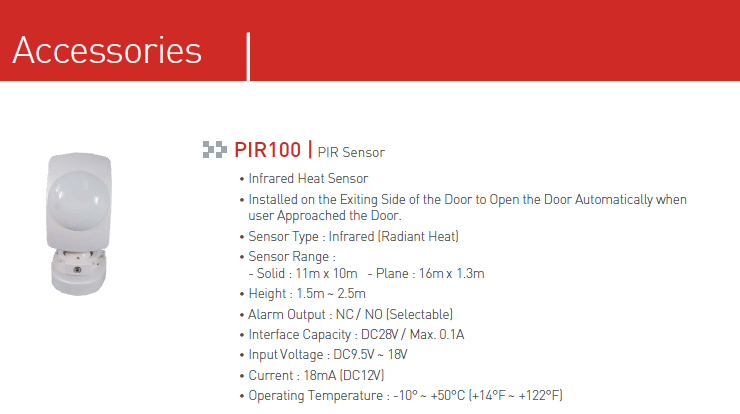 • Àû¿Ü¼± ÀÎü °¨Áö¼¾¼ • ÃâÀÔ¹®ÀÇ Åð½Ç¹æÇâ¿¡ ¼³Ä¡ÇÏ¿© »ç¶÷ÀÌ Á¢±ÙÇϸé Àû¿Ü¼± °¨Áö¸¦ ÅëÇØ ÀÚµ¿À¸·Î ¹®ÀÌ ¿¸®°Ô ÇÏ´Â ¼¾¼ • ¼¾¼ Á¾·ù : Àû¿Ü¼±(º¹»ç¿) • ¼¾¼ ÀÛµ¿ ¹üÀ§ - Solid : 11m x 10m - Plane : 16m x 1.3m • ³ôÀÌ : 1.5m ~ 2.5m • °æº¸ Ãâ·Â(¼±Åð¡´É) : NC / NO • Çã¿ë Àü·Â : DC28V / Max. 0.1A • Àΰ¡ Àü¾Ð : DC9.5V ~ 18V • ¼Ò¸ð Àü·ù : 18mA(DC12V) • ÀÛµ¿ ¿Âµµ : -10¡ÆC ~ +50¡ÆC (+14¡ÆF ~ +122¡ÆF) |