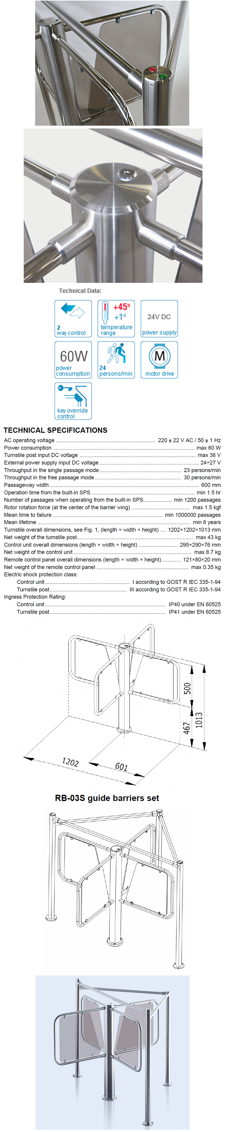 The rotor turnstiles feature several operating modes set from the control panel and are intended for bi-directional single or multiple passages. Passage can be controlled in either direction.