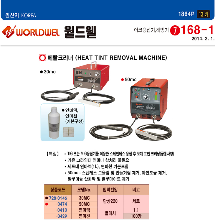 [¿ùµåÀ£] ¸ÞŻŬ¸®³Ê(30MC, ´Ü»ó220V, TIG/MIGÀÌ¿ë ½ºÅ×Àη¹½º ¿ëÁ¢¸ðÀç Ç¥¸é Å©¸®´×)(Heat Tint Removal Machine)=>Á¦Ç°´ÜÁ¾!
